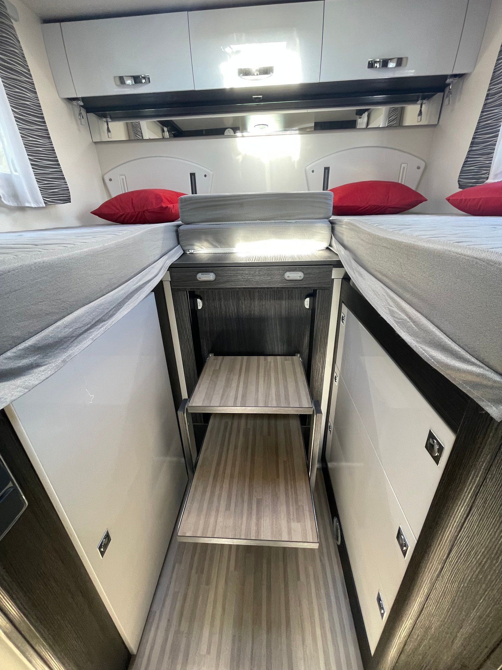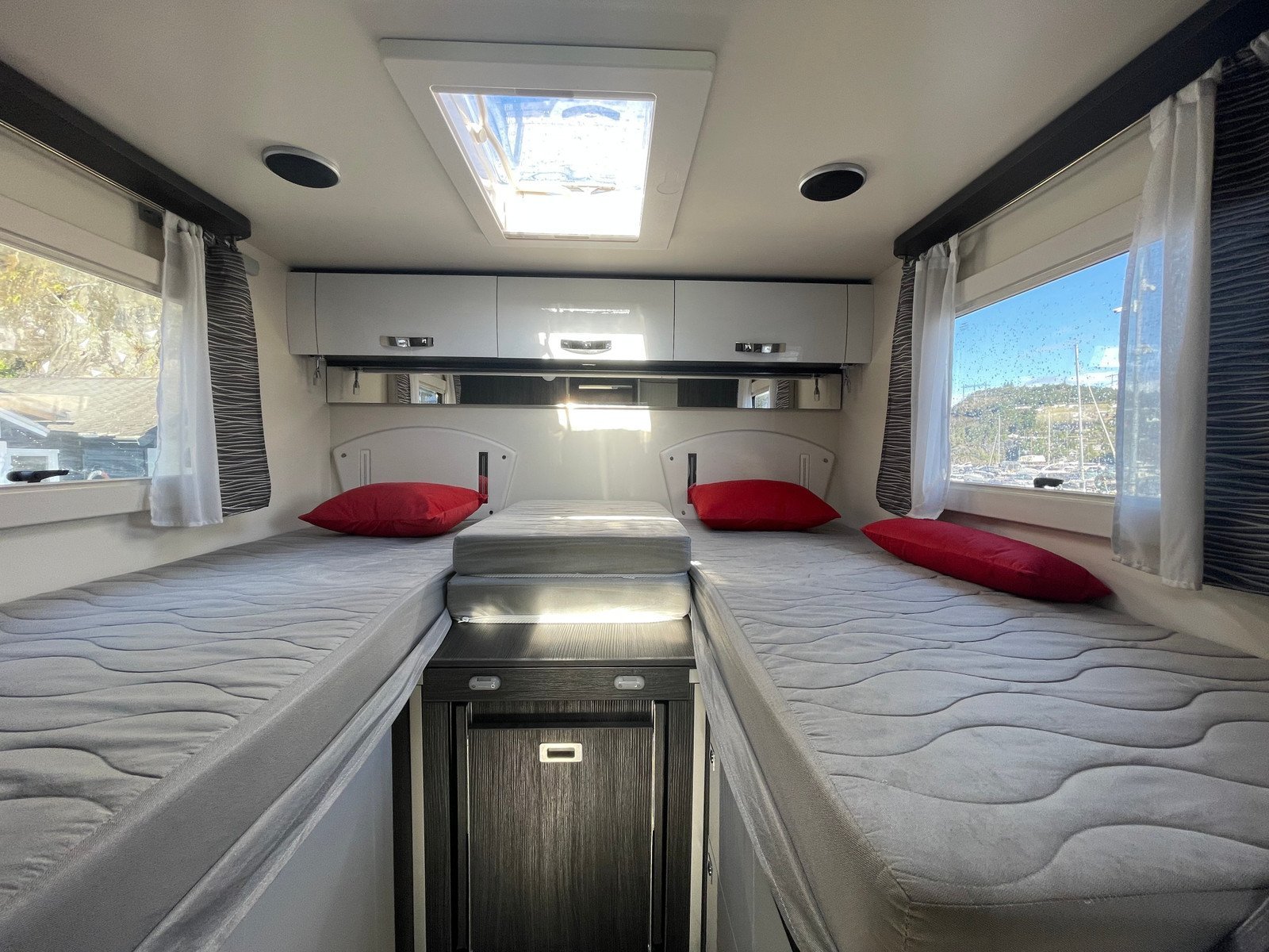 A l’arrière du véhicule, il y a deux lits simples qui peuvent facilement être convertis en un grand lit double si désiré.