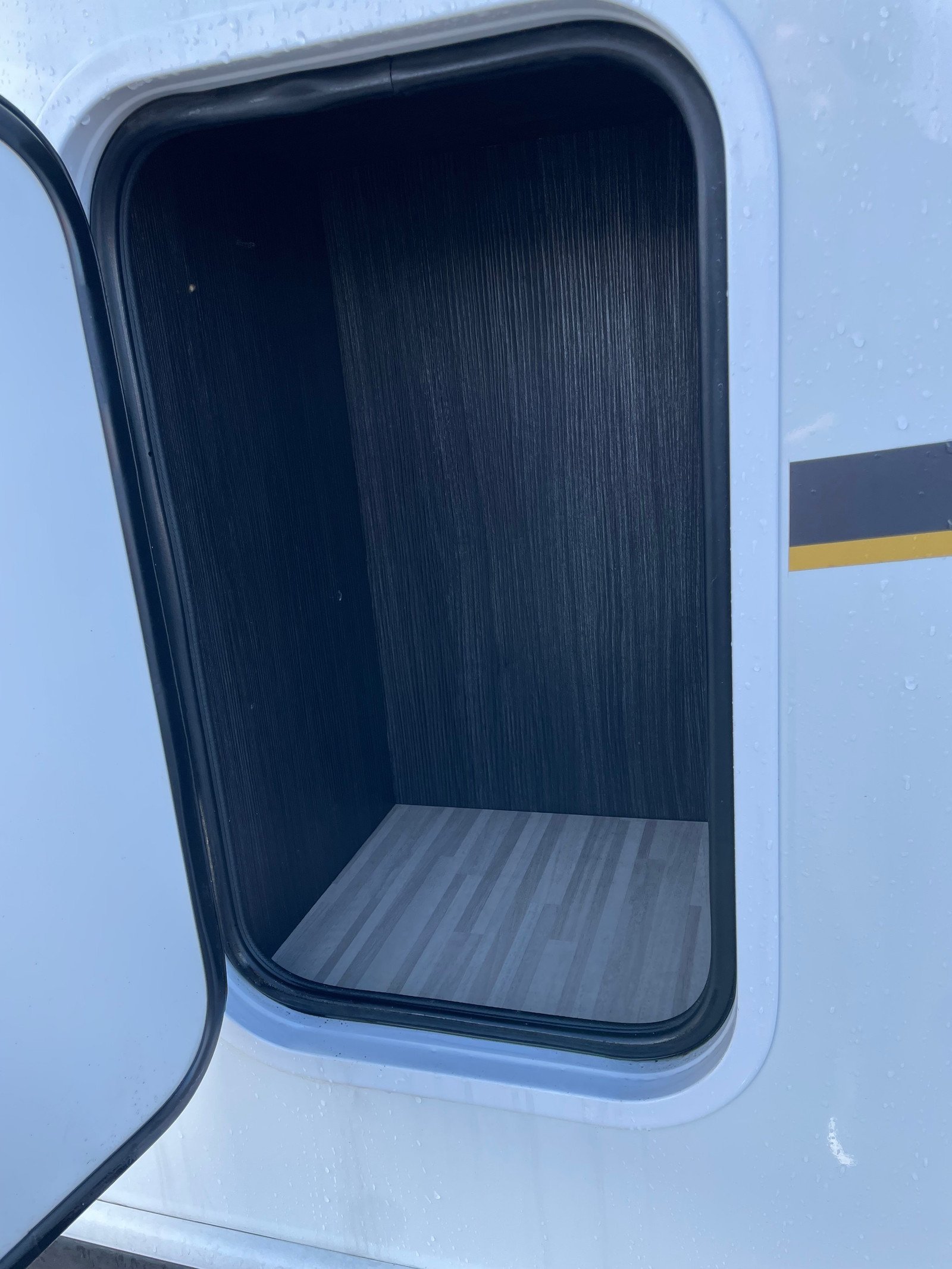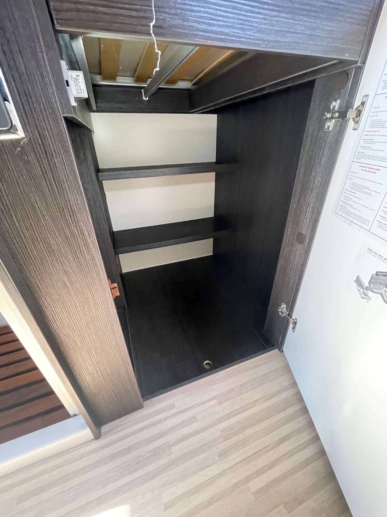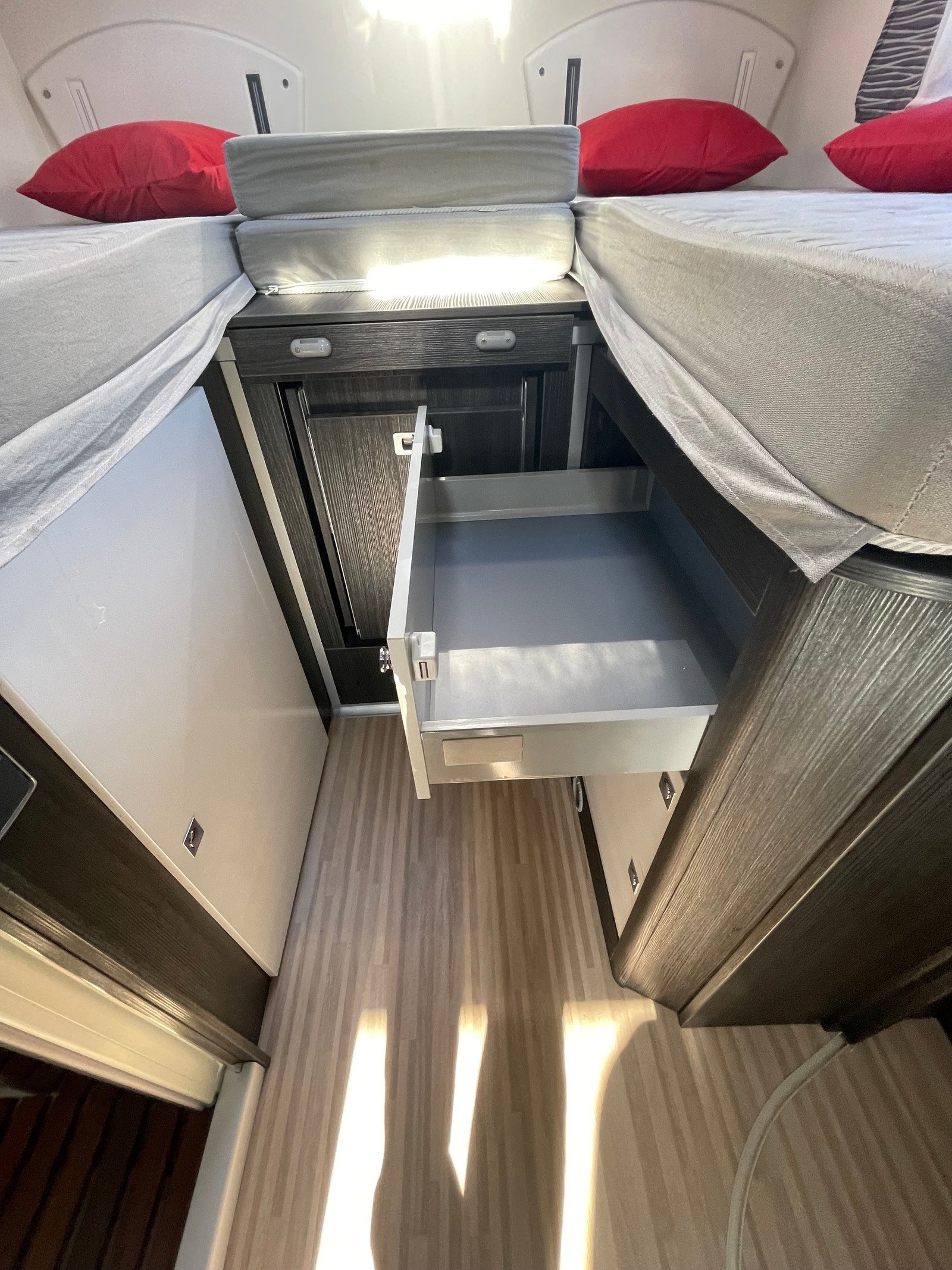 Beaucoup d’espace de rangement dans les placards au-dessus du lit + tiroirs et placards sous le lit. Le garage de ce modèle est spacieux grâce à cette disposition (espace pour les vélos dans le garage).