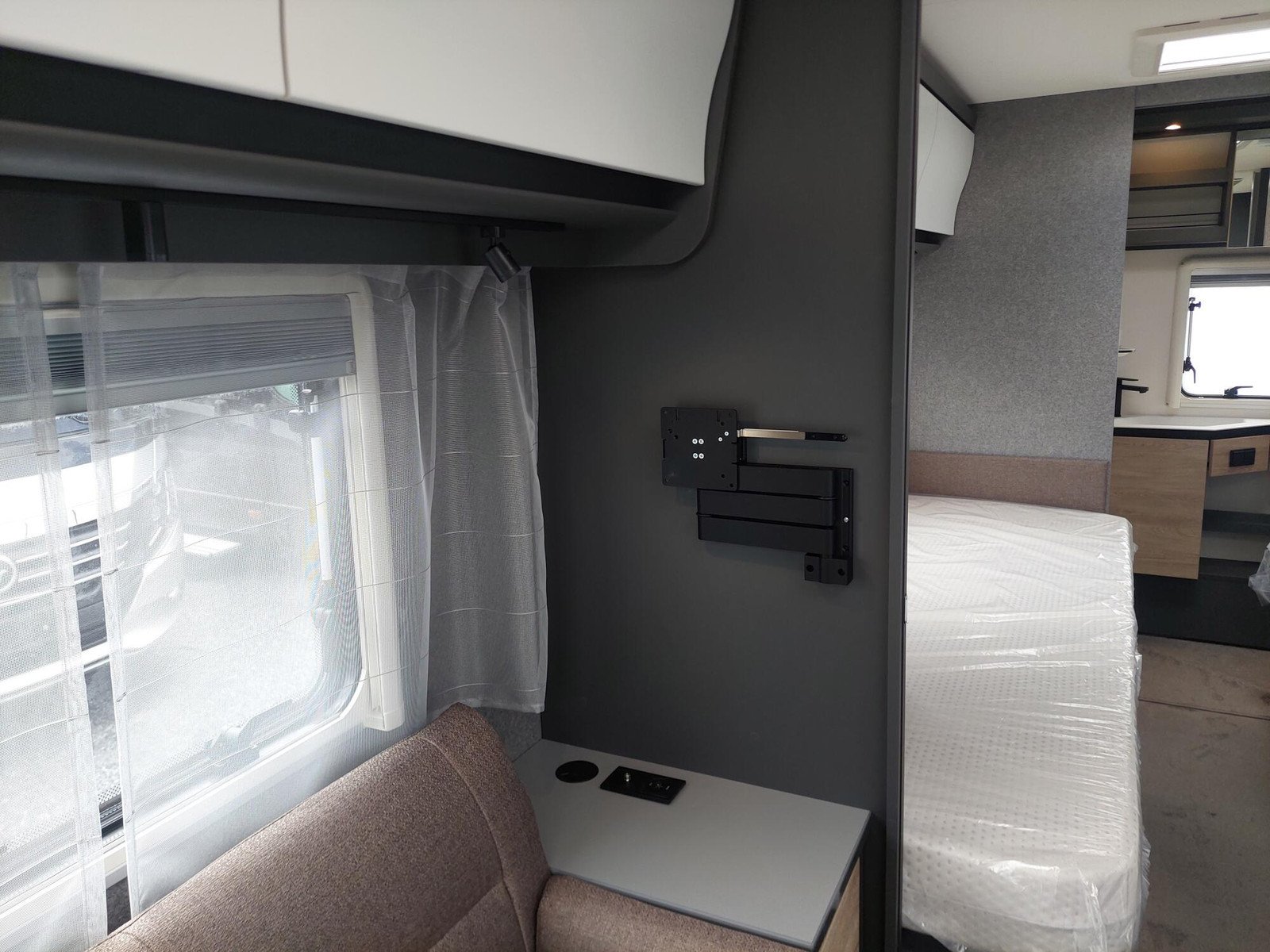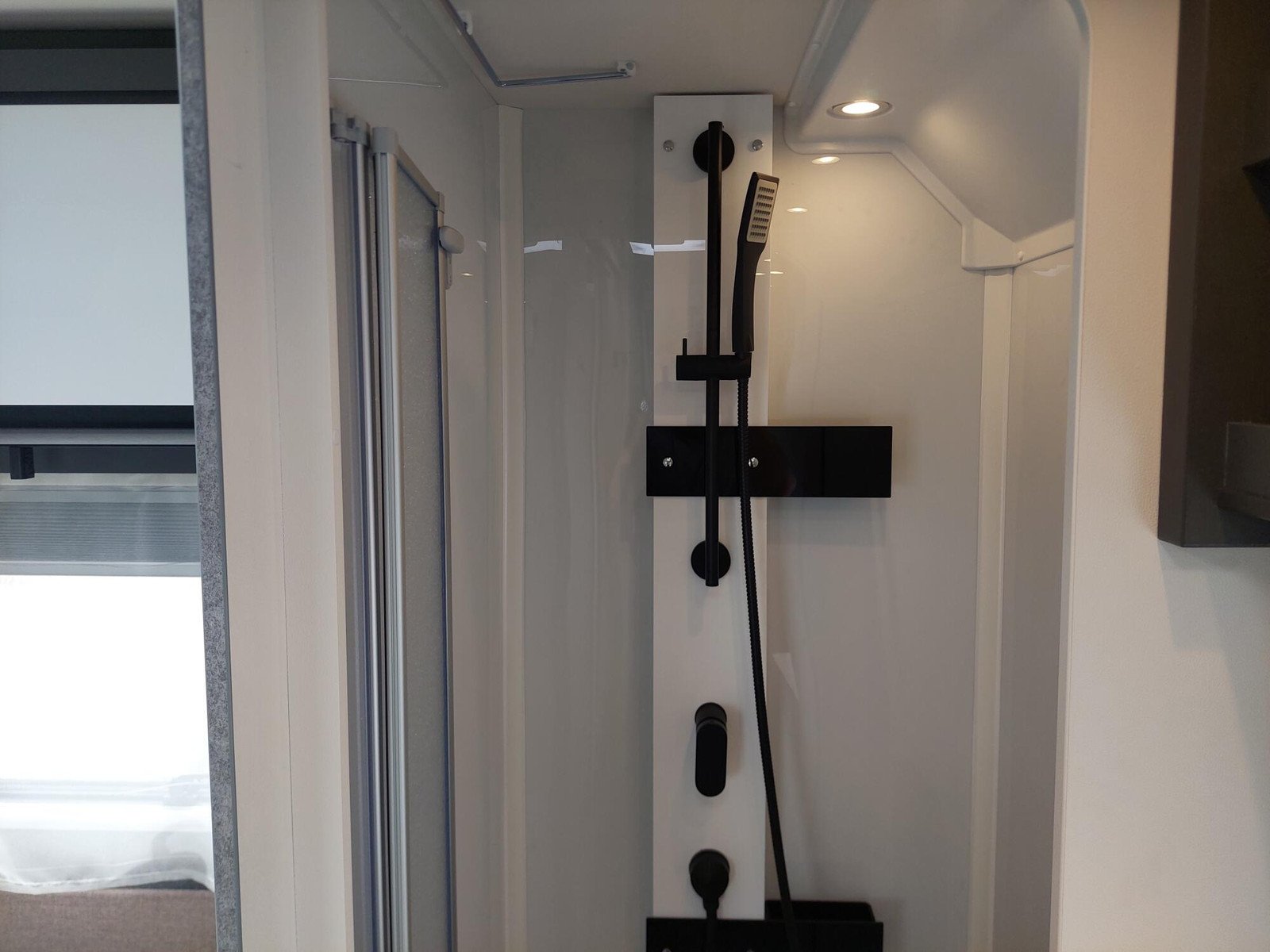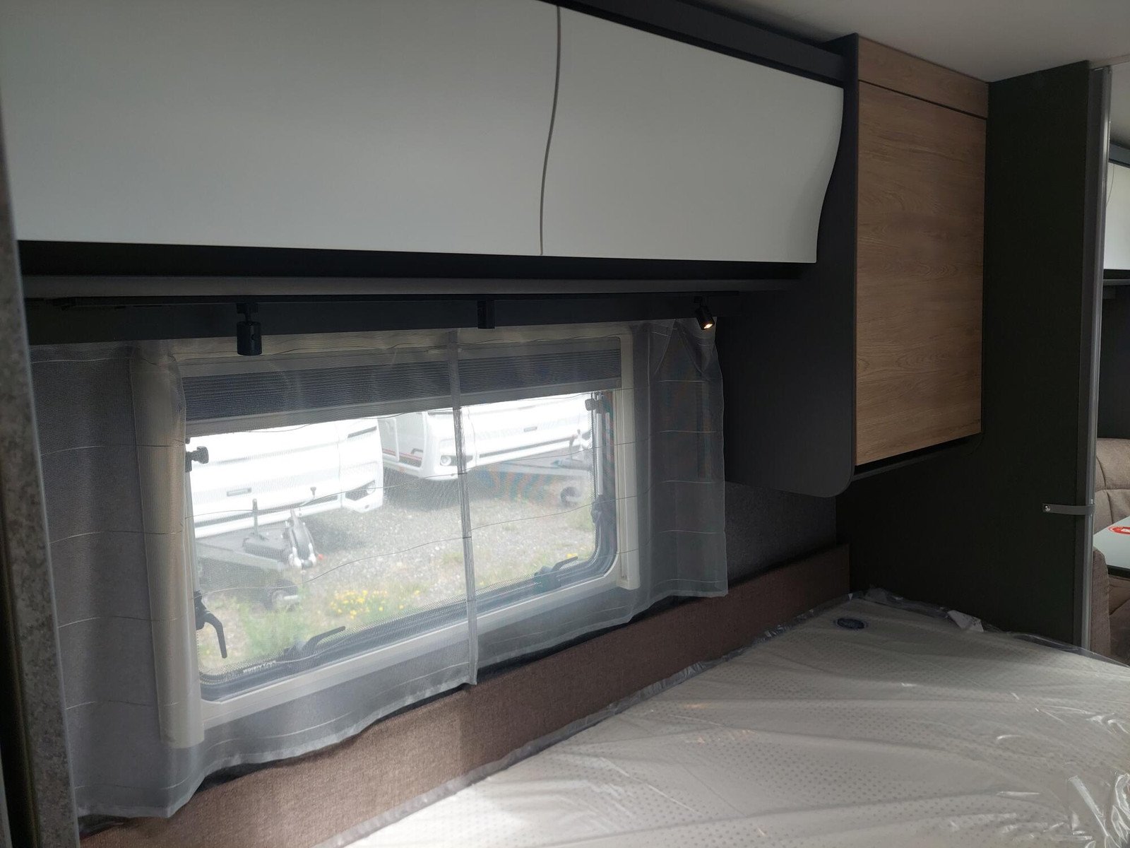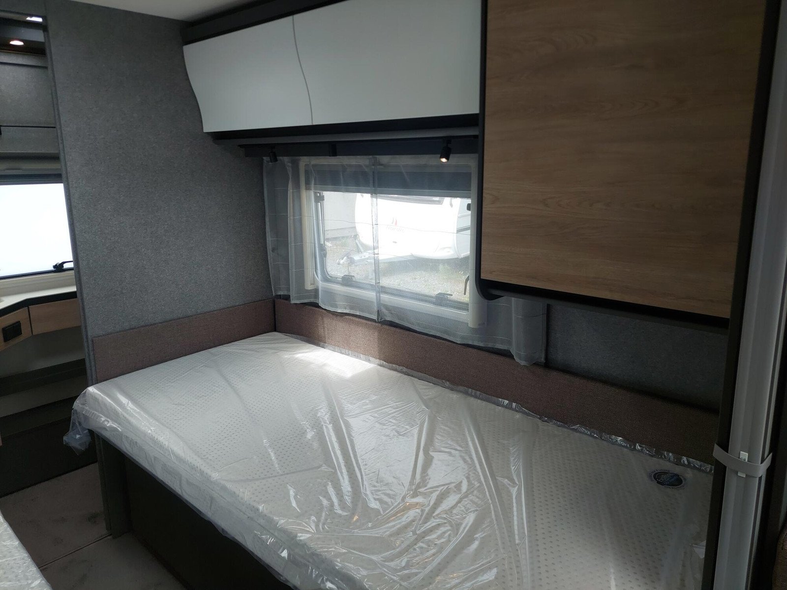 La cuisine à l’avant du Beduin est tout simplement phénoménale. Elle impressionne par son équipement, ses rangements et ses accoudoirs. La grande baie vitrée laisse entrer beaucoup de lumière et d’air frais tout en offrant une belle vue. Le spacieux lit double central peut être avancé et reculé, offrant un meilleur accès à la salle de bain pendant la journée. Sous le lit se trouve un grand compartiment de rangement, également accessible depuis l’extérieur.
