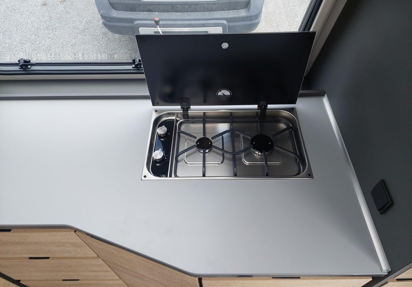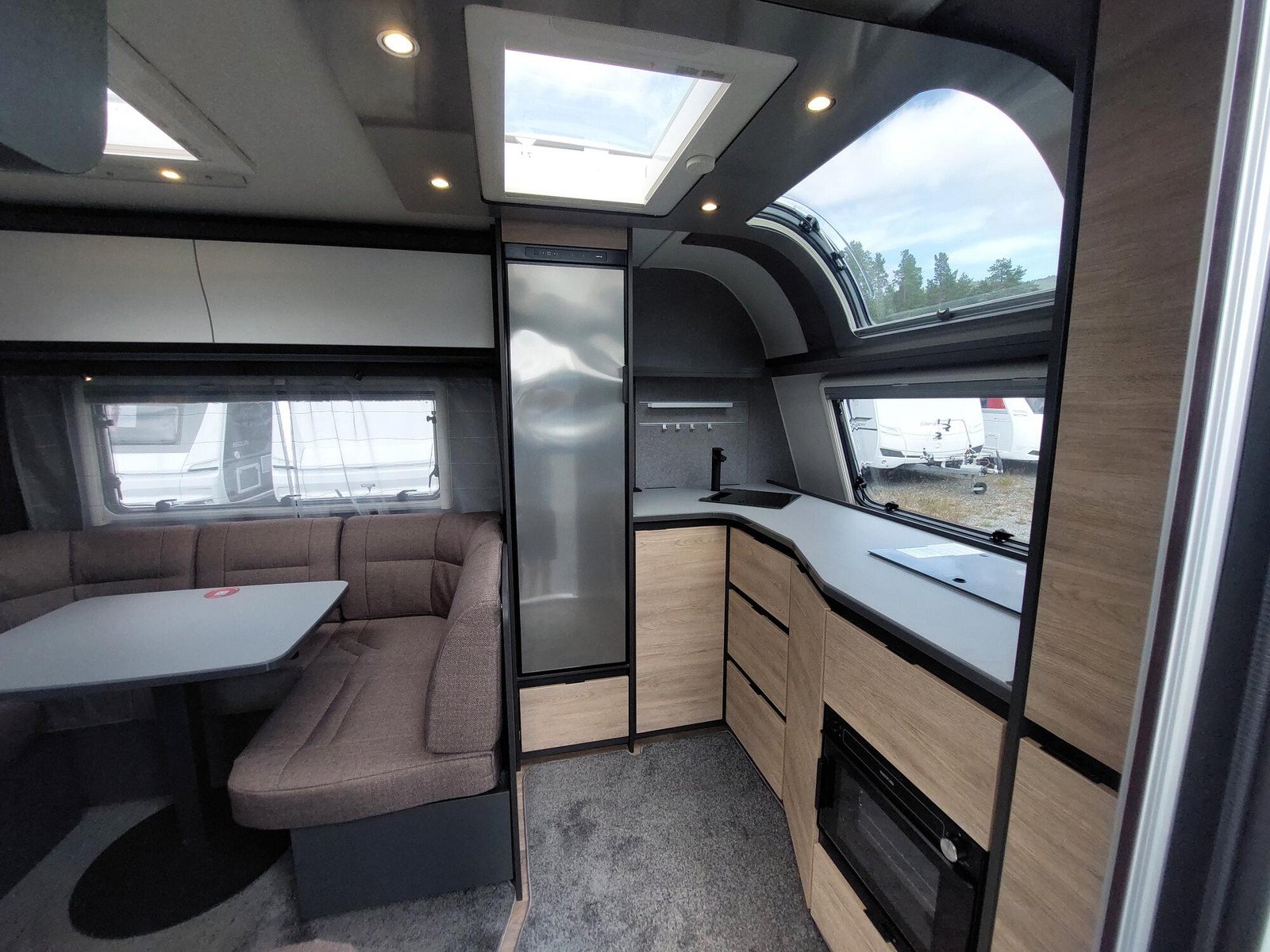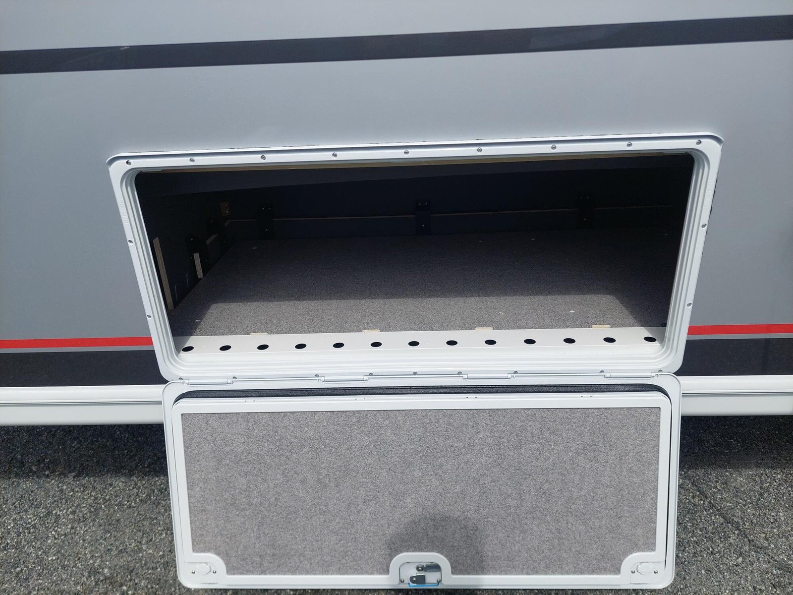 La cuisine à l’avant du Beduin est tout simplement phénoménale. Elle impressionne par son équipement, ses rangements et ses accoudoirs. La grande baie vitrée laisse entrer beaucoup de lumière et d’air frais tout en offrant une belle vue. Le spacieux lit double central peut être avancé et reculé, offrant un meilleur accès à la salle de bain pendant la journée. Sous le lit se trouve un grand compartiment de rangement, également accessible depuis l’extérieur.