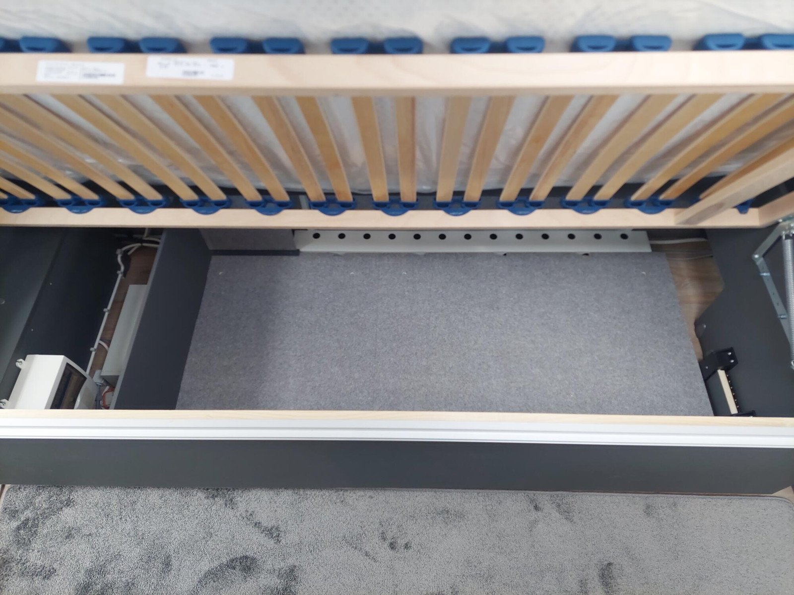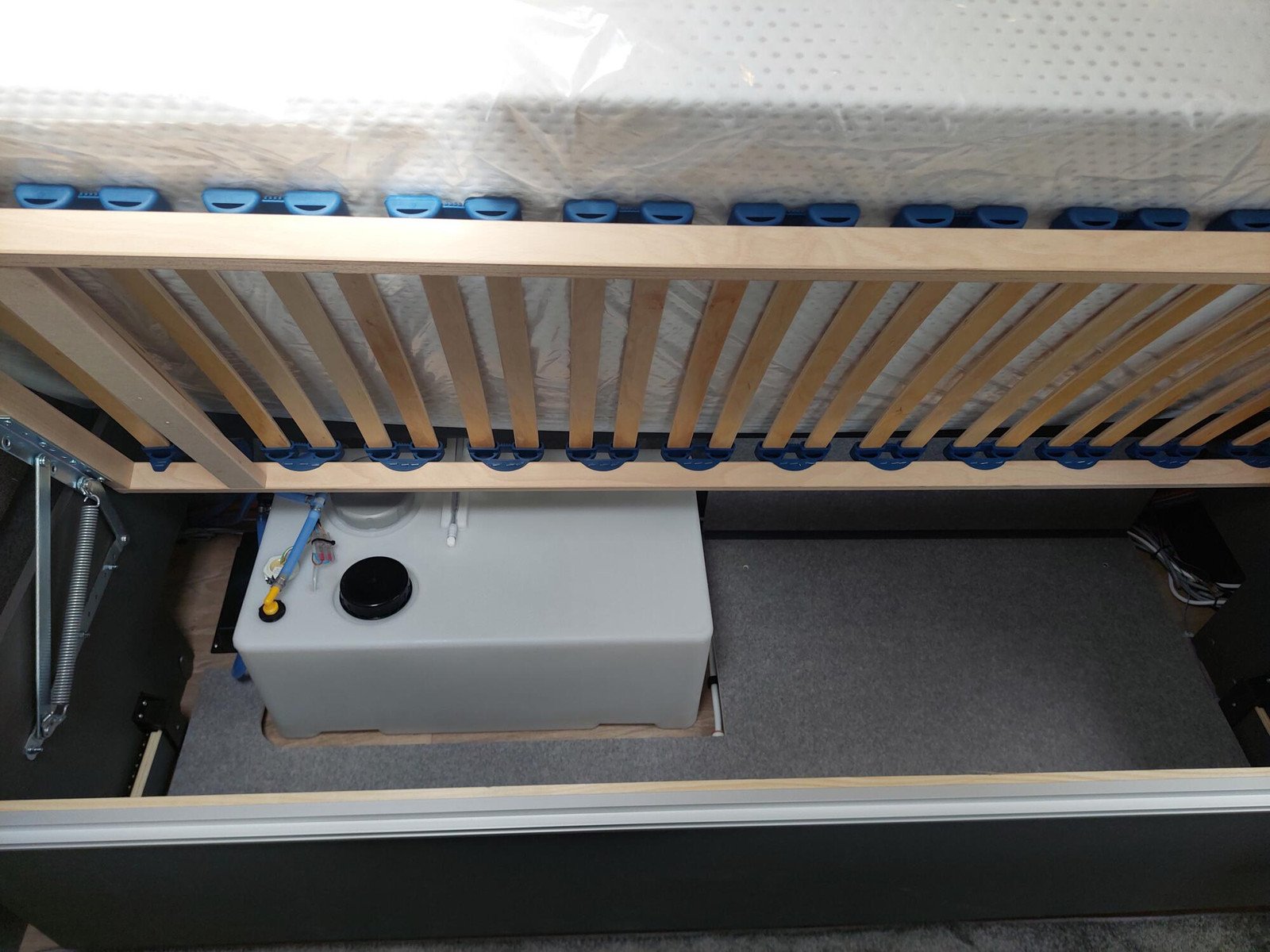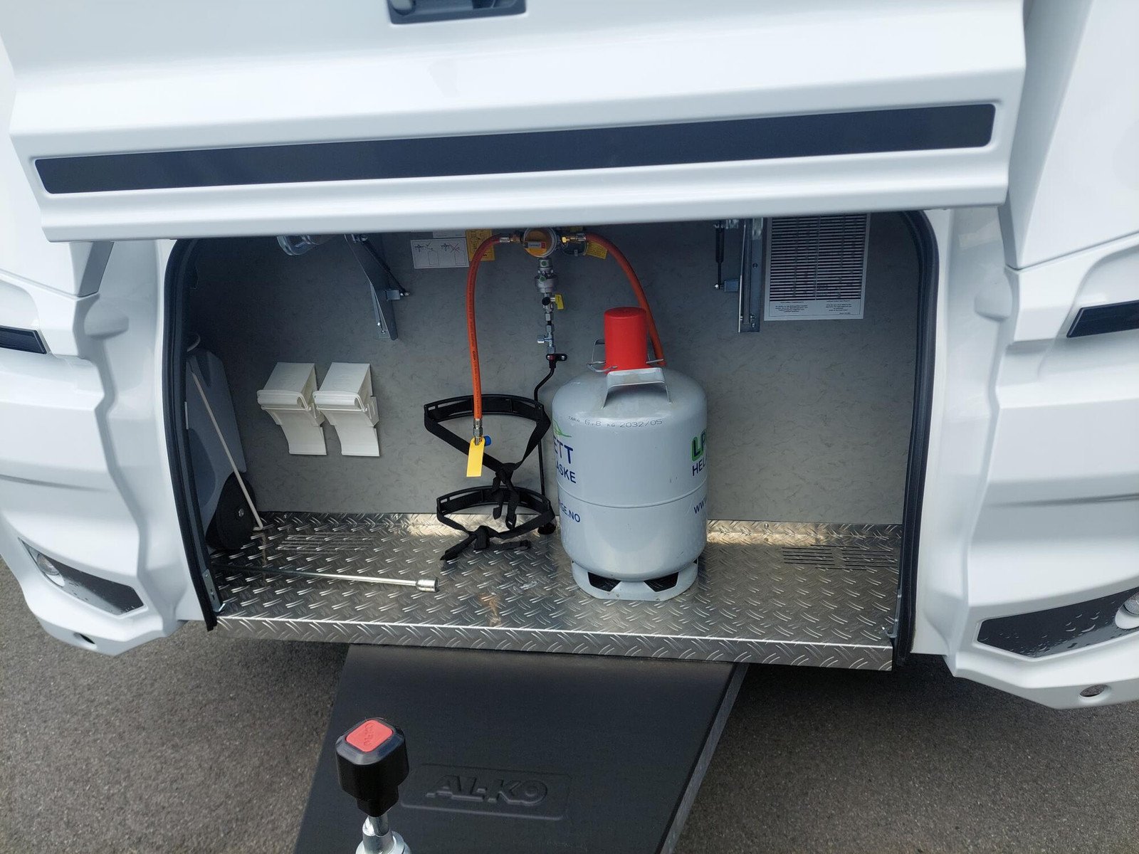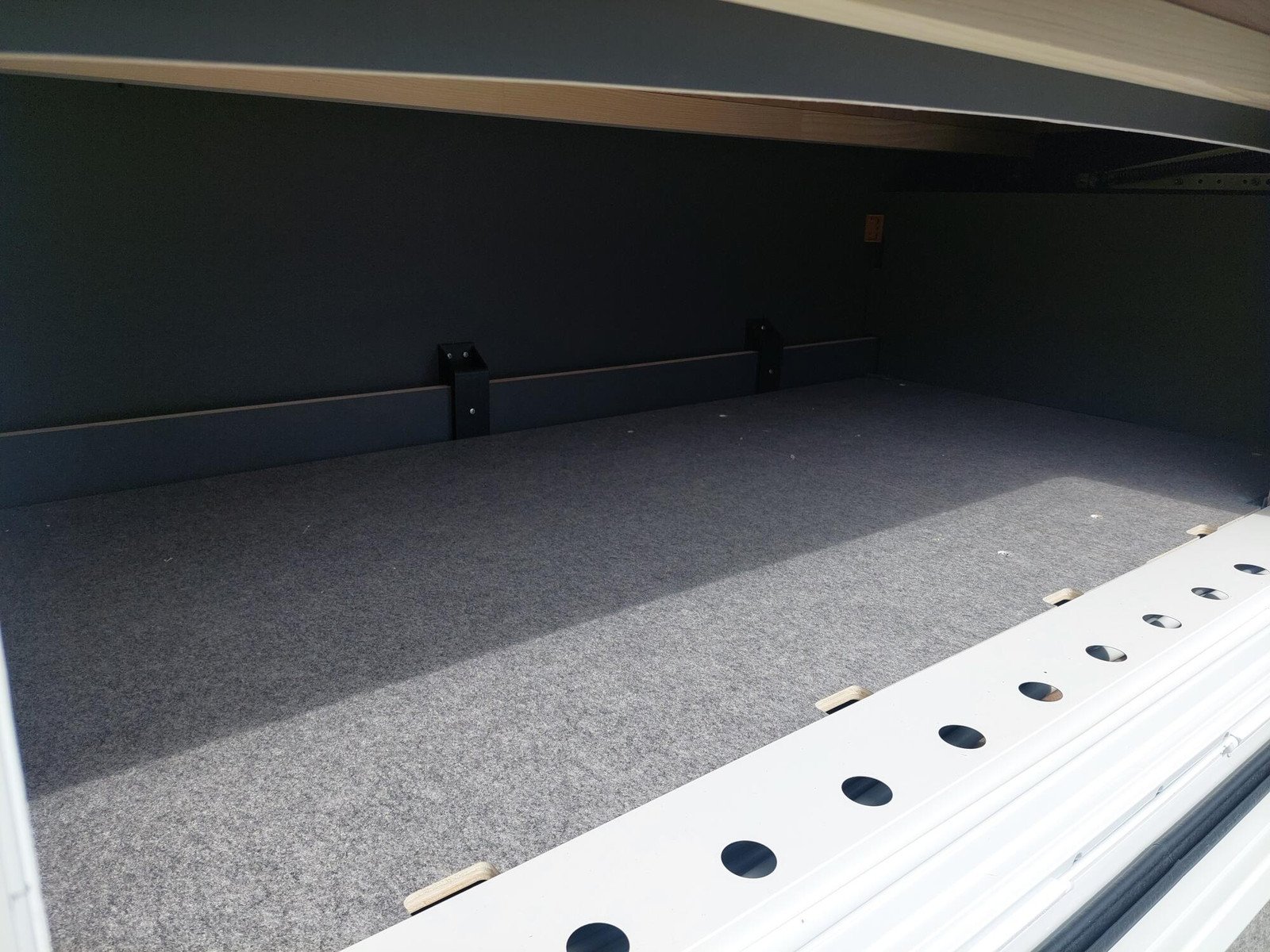 La cuisine à l’avant du Beduin est tout simplement phénoménale. Elle impressionne par son équipement, ses rangements et ses accoudoirs. La grande baie vitrée laisse entrer beaucoup de lumière et d’air frais tout en offrant une belle vue. Le spacieux lit double central peut être avancé et reculé, offrant un meilleur accès à la salle de bain pendant la journée. Sous le lit se trouve un grand compartiment de rangement, également accessible depuis l’extérieur.
