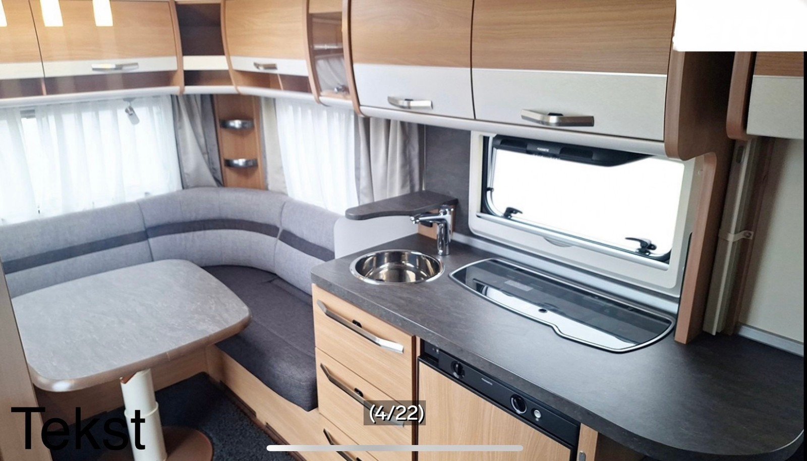 • Le salon à l’arrière dispose d’un canapé en U très spacieux et confortable dans un beau revêtement de sélection argentée, de spots au plafond et d’un téléviseur fixé au mur qui peut également être tourné vers le lit. Le canapé peut facilement être converti en 2 lits supplémentaires si nécessaire.