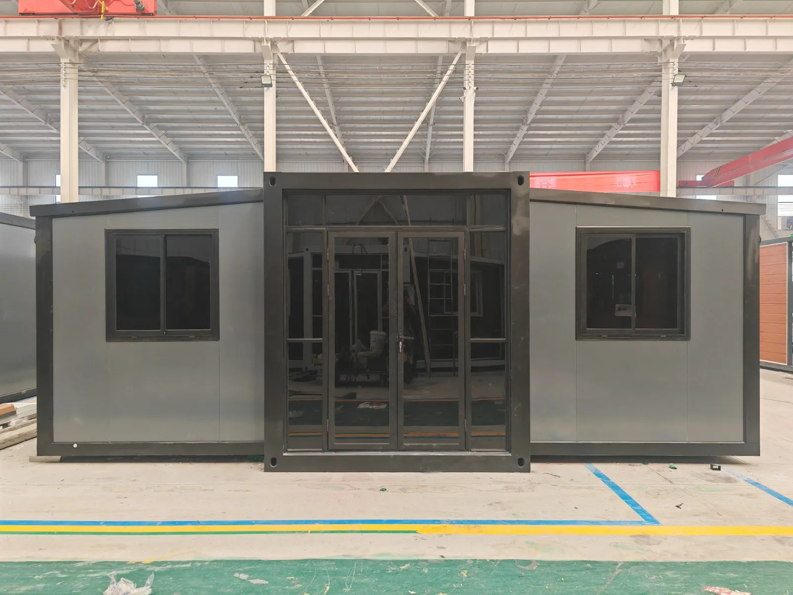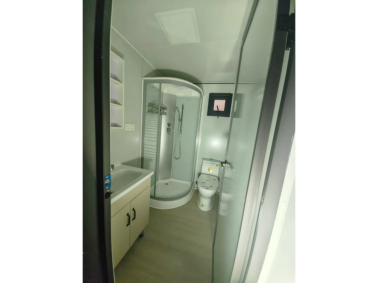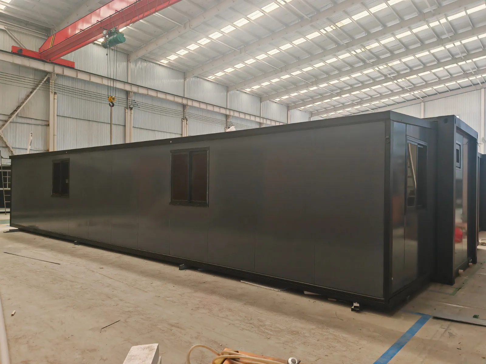 Équipée de murs et d’un toit isolés ; 2 chambres ; séjour avec coin cuisine ; salle de bain avec douche, WC et lavabo ; chaque pièce est équipée d’un éclairage et de prises 230 V ; placard à compteurs ; sol PVC ; fenêtres et portes en aluminium ; verrouillable ; raccordements eau, électricité et tout-à-l’égout faciles ; neuve et prête à être transportée (dimensions transport : 9000 x 220 x 248 cm, poids : 3500 kg)