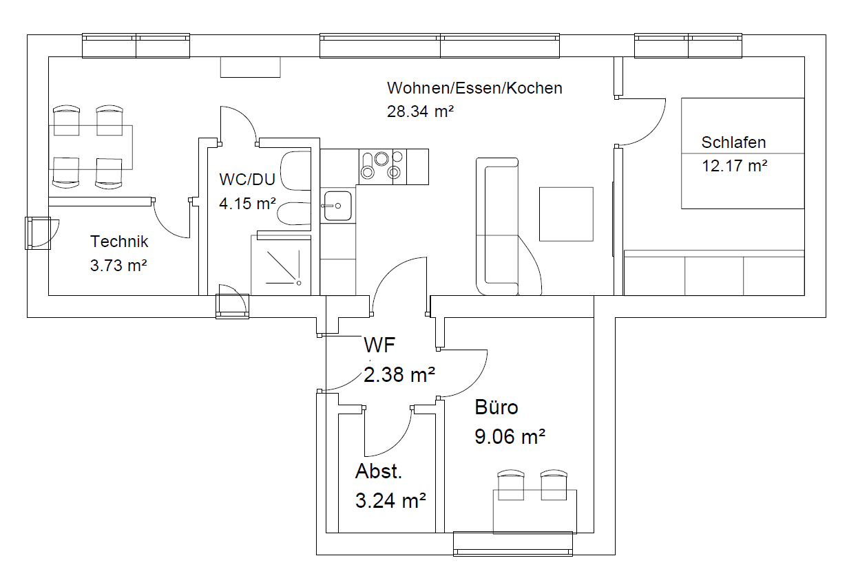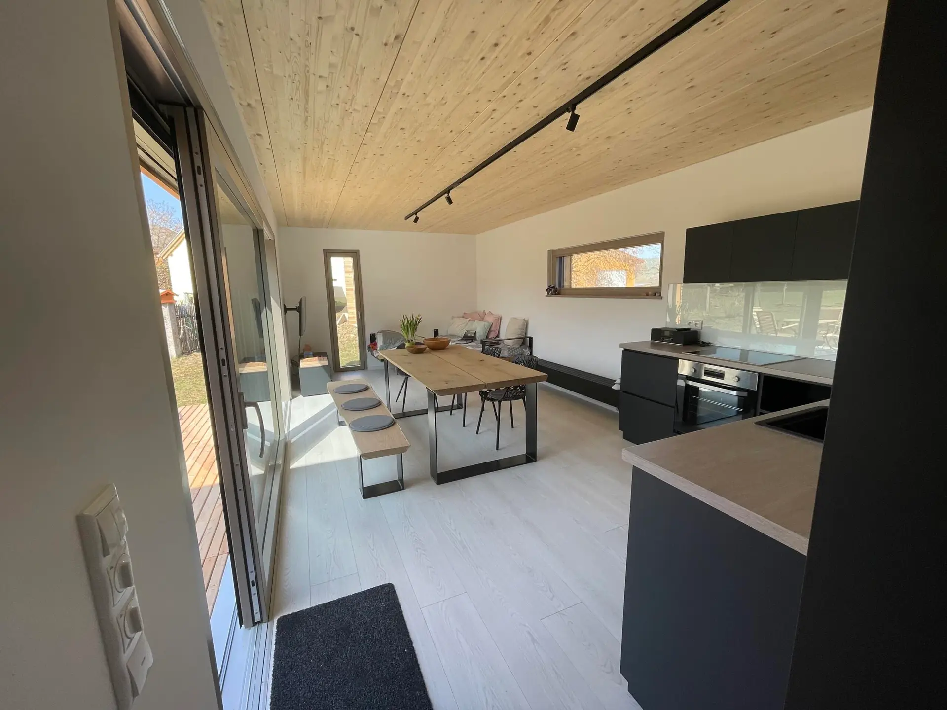 Le module principal (chambre, salon/salle à manger, cuisine, salle de bains) est équipé comme suit :