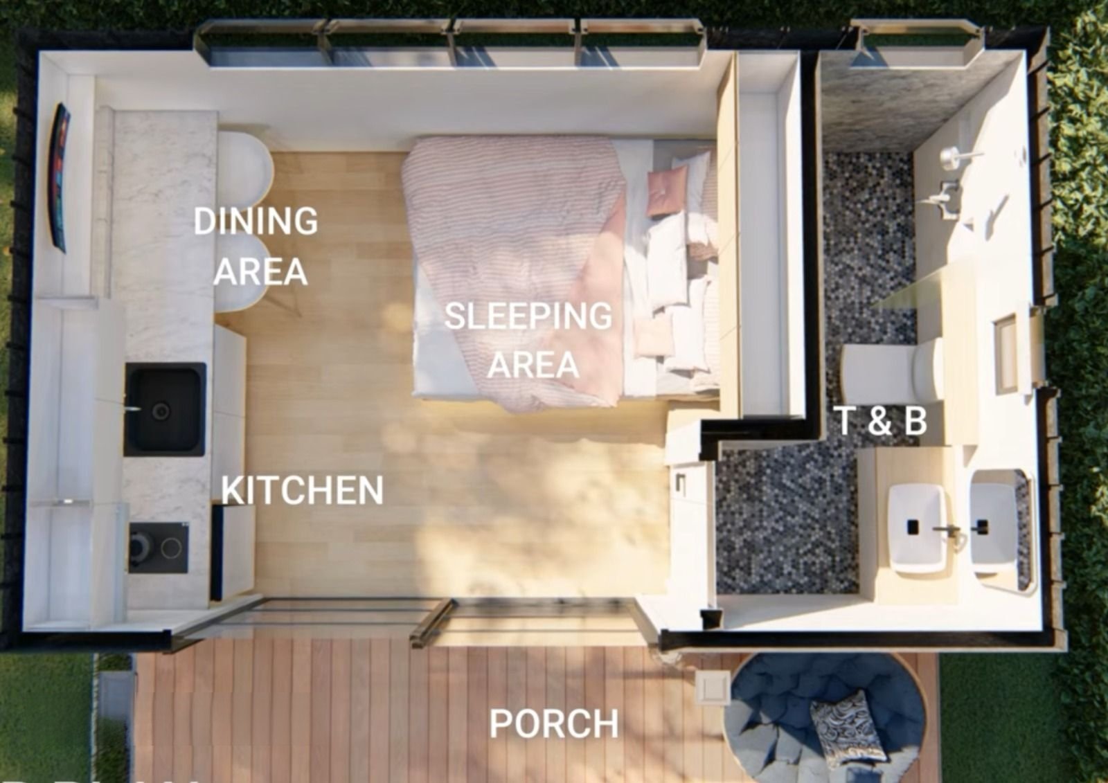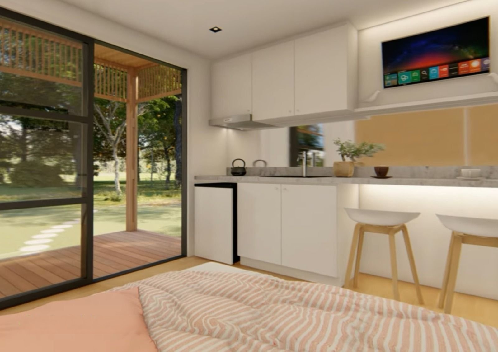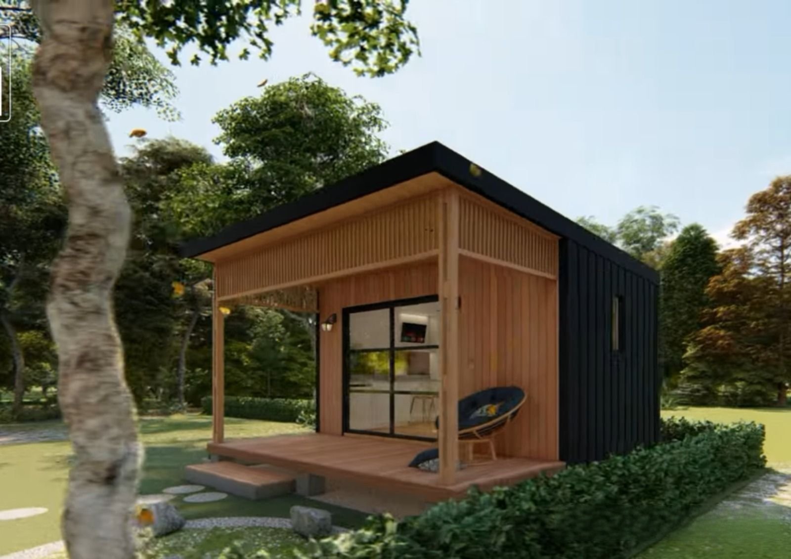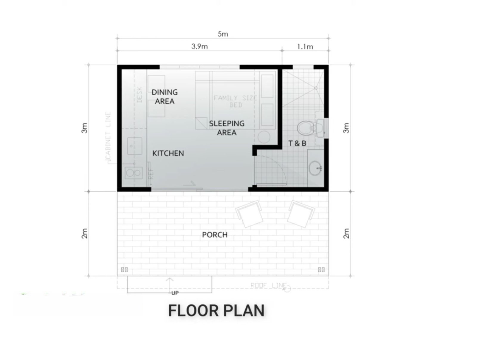 Ce chalet modulaire comprend un coin repas, une cuisine et une salle de bain intégrés, personnalisables selon les besoins du client. Sa surface au sol est de 5 m x 3 m, soit une surface totale de 15 m²