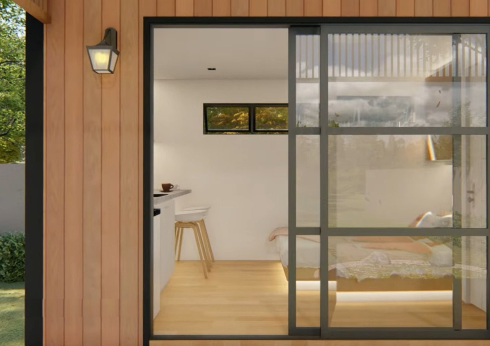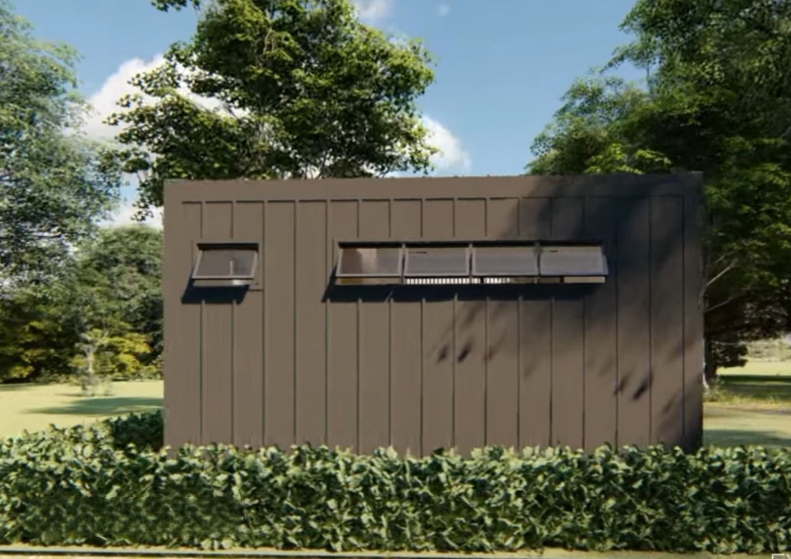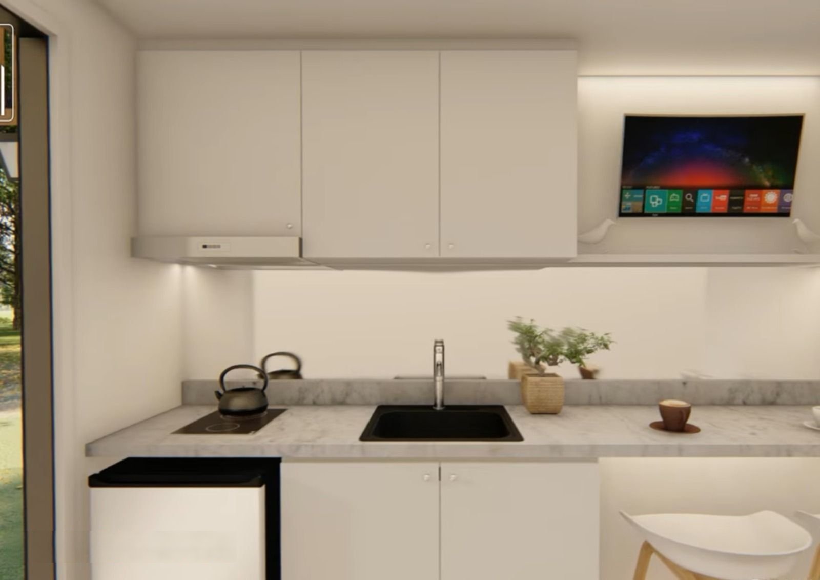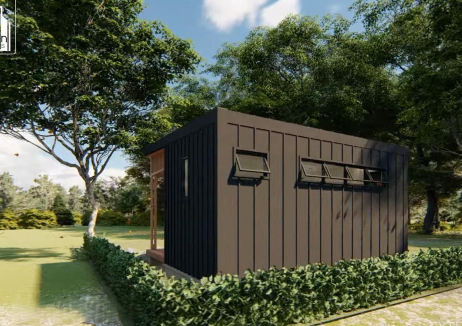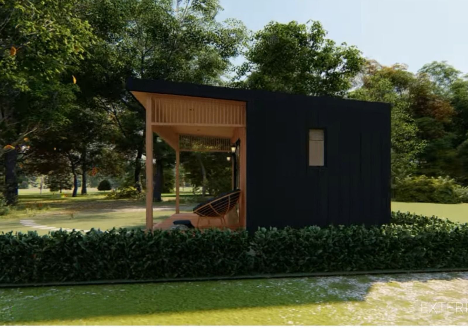 Ce chalet modulaire comprend un coin repas, une cuisine et une salle de bain intégrés, personnalisables selon les besoins du client. Sa surface au sol est de 5 m x 3 m, soit une surface totale de 15 m²