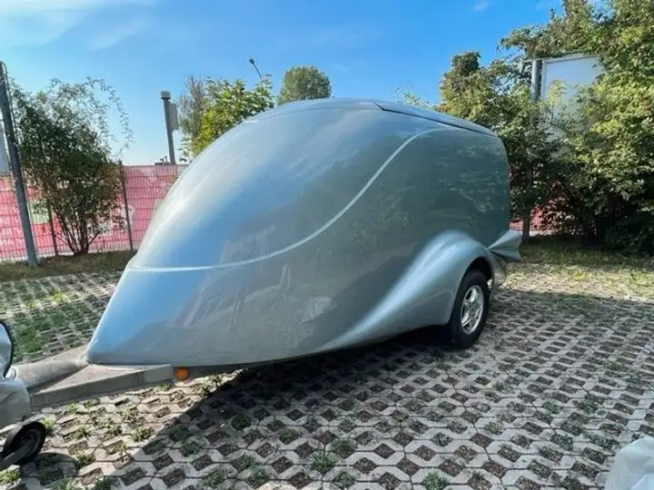 Remorque moto très bien conservée de la MARQUE PREMIUM EXCALIBUR en très bon état pour le compte des CLIENTS. Il reste encore 2 amortisseurs neufs du hayon, y compris la remorque a toujours été recouverte depuis le début d’une bâche de camion fabriquée SPÉCIALEMENT pour lui, de sorte que la peinture est en parfait état.