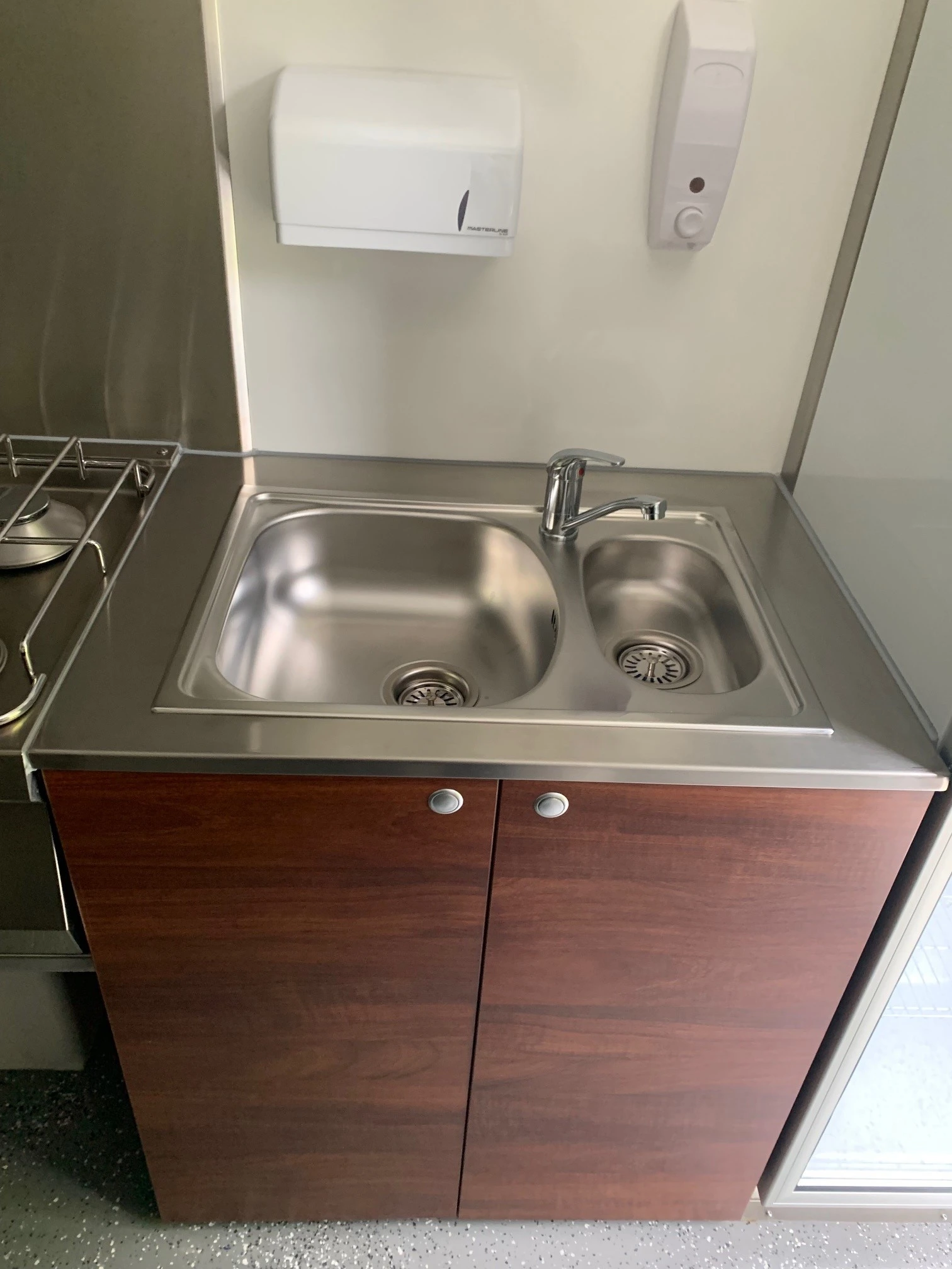 Au bas du meuble avec des bidons d’eaux fraîches et usées,